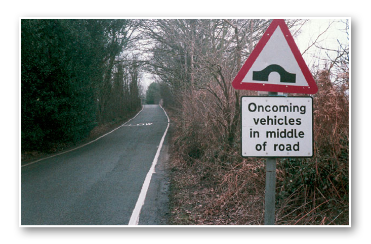 You should slow down and be cautious. The bridge is narrow and there may not be enough room for you to pass an oncoming vehicle at this point. Also, there's no footpath, so be aware of pedestrians in the road.